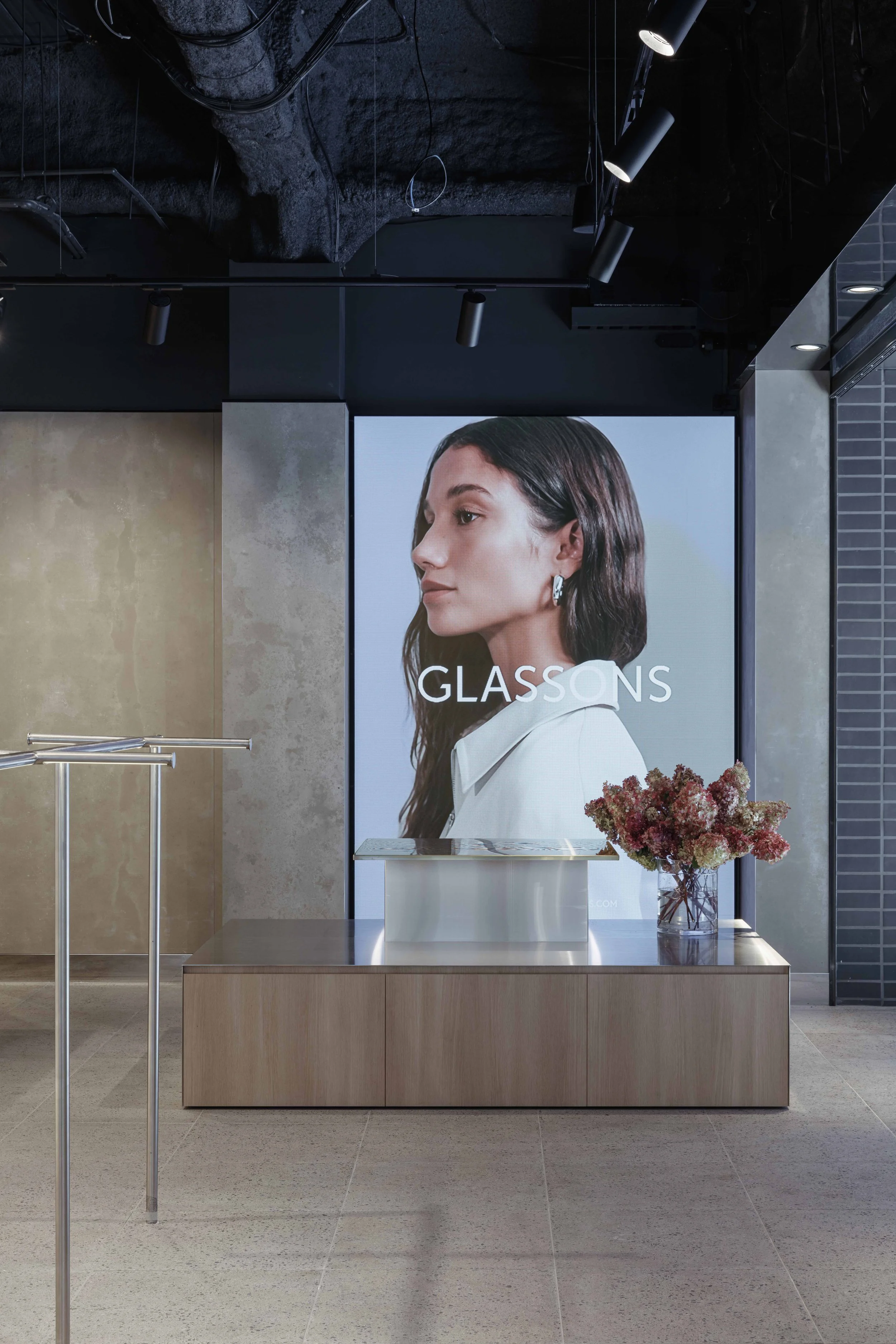 Stainless blades float in front of the fitting rooms, subtly signalling a change in function to the customer.