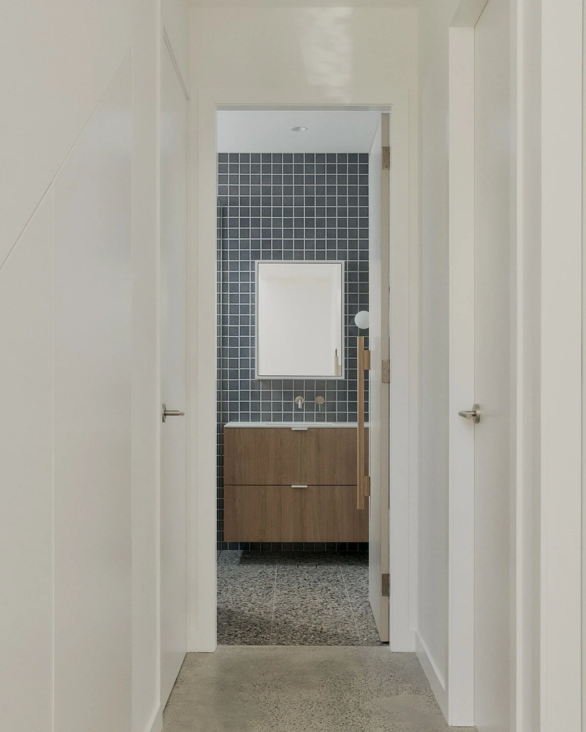 Bucking the coastal trend of light oak and white bathrooms, Perry has opted for warm FSC Tasmanian Oak timber, Squid Ink walls and Japanese mosaic tiles. These add depth and warmth to this restrained space, enhancing the white vaulted ceiling.